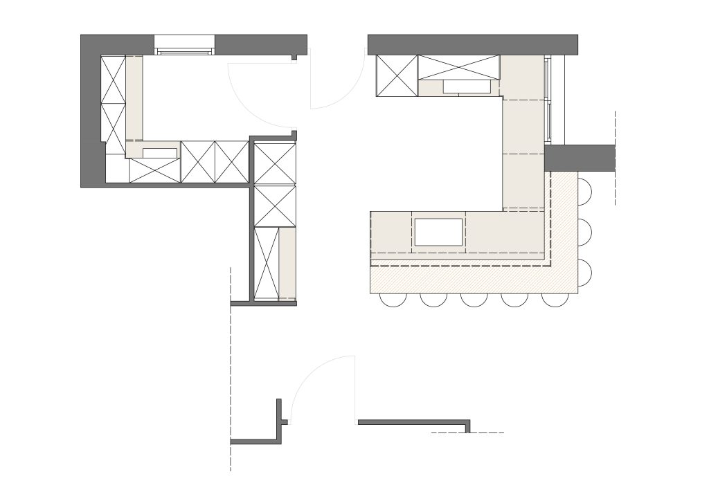 Distribución en L con isla central: la zona de cocción y preparación se organiza de forma ergonómica, garantizando recorridos cortos y funcionales. La isla, además de incorporar fregadero y zona de apoyo, ofrece una amplia superficie de trabajo y barra para hasta seis comensales.